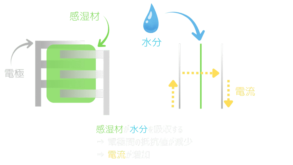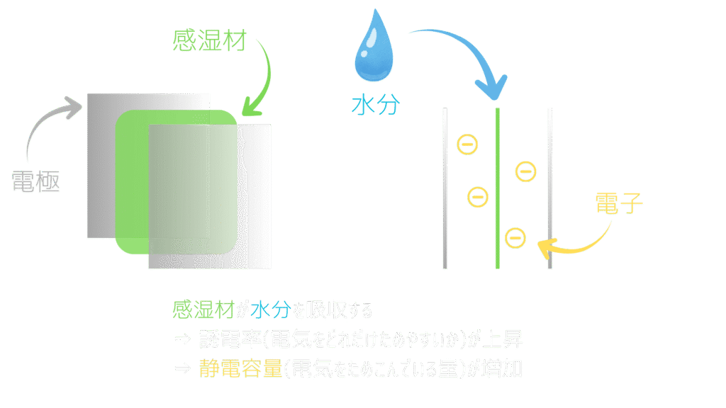 上記2種類とも水分を感湿材が吸収し、それによって静電容量または抵抗が変化するという、電気の特性を活用して湿度を測定しています。
